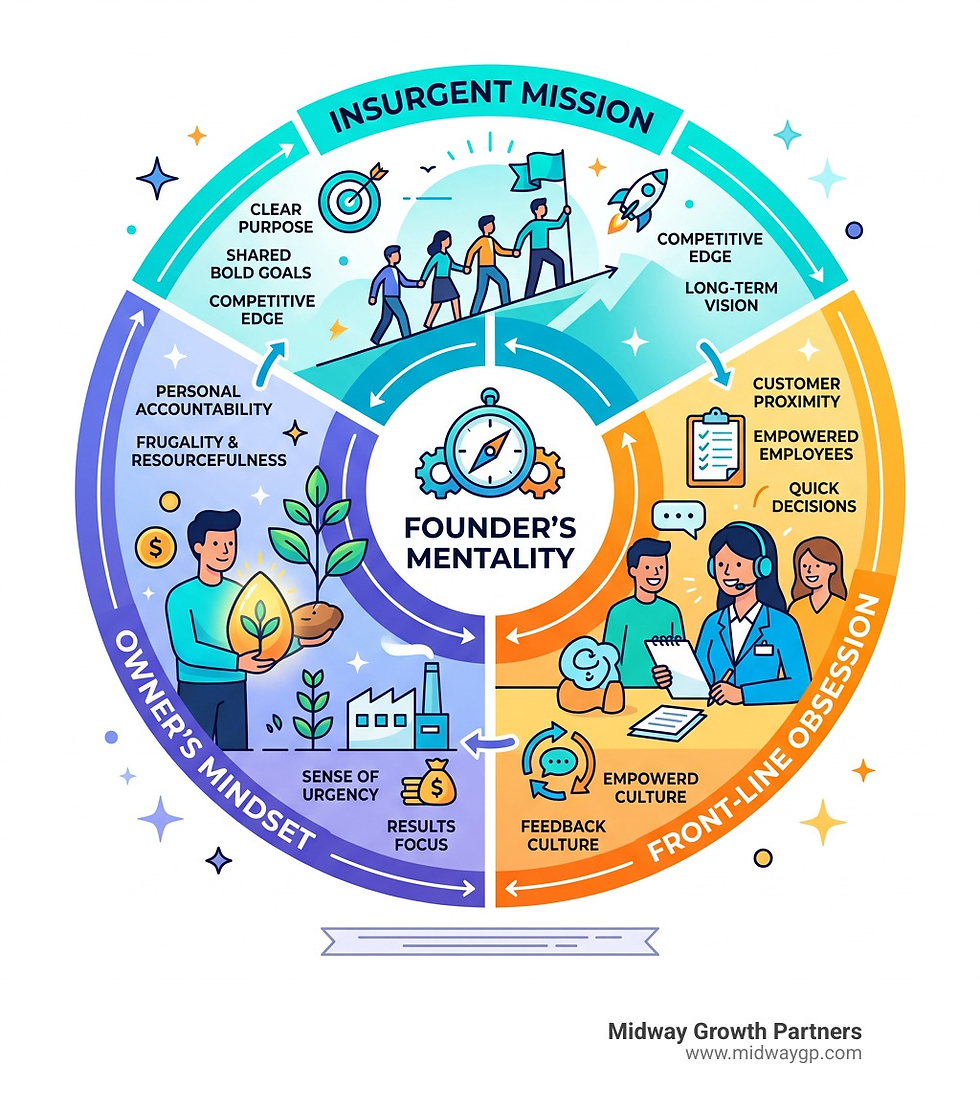 At Midway Growth Partners, we see it daily: growth creates complexity, and complexity is the silent killer of growth. This is the "Growth Paradox." To overcome it, we must look at the core elements of the Founder's Mentality. This isn't just about the person who started the company; it’s a specific organizational state of mind.